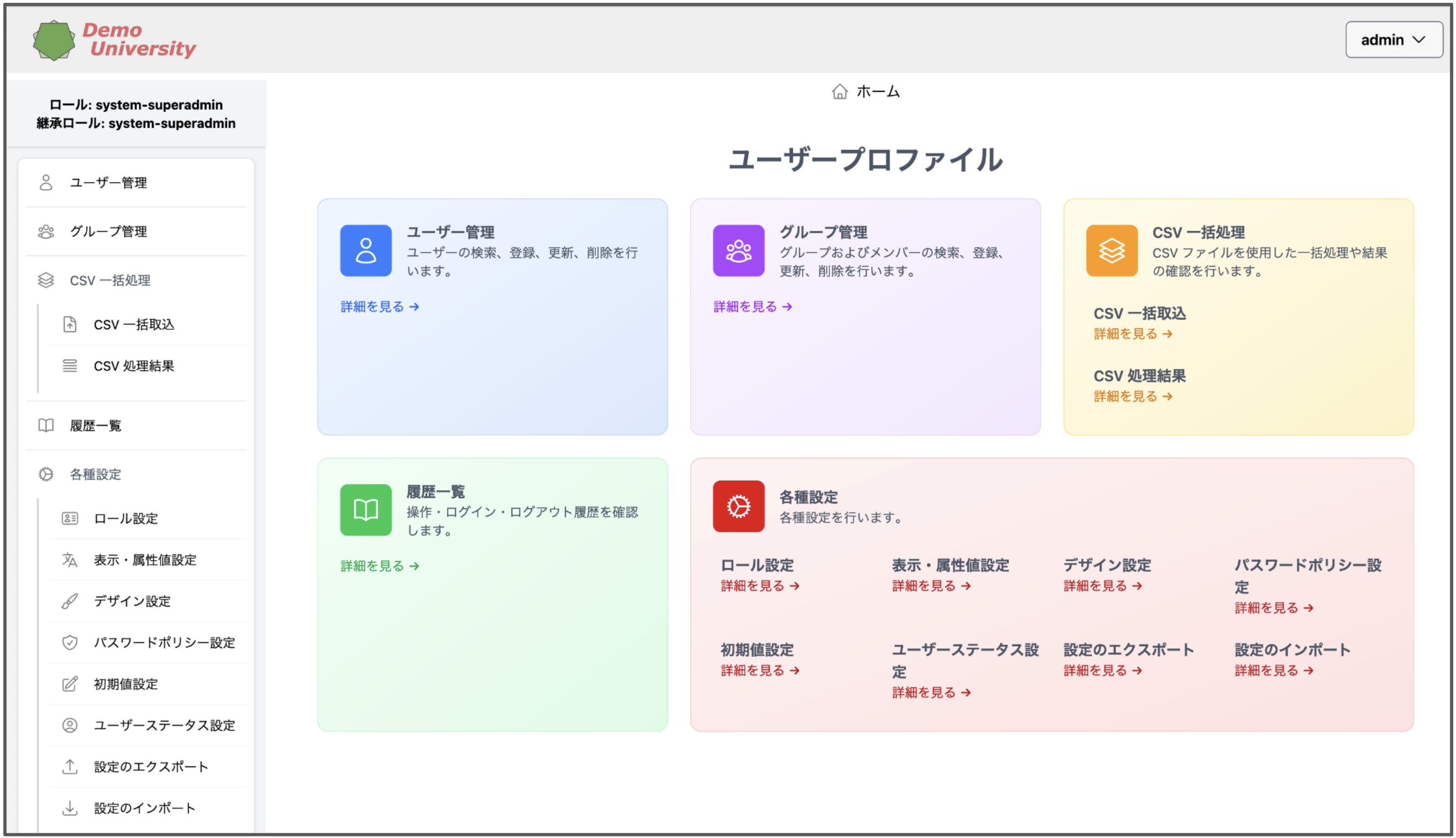 ユーザープロファイル画面には管理者の画面もあります。管理者の方が連携元 OpenLDAP, Active Directory に存在するユーザー/グループ情報を閲覧・編集できる機能を提供しています。