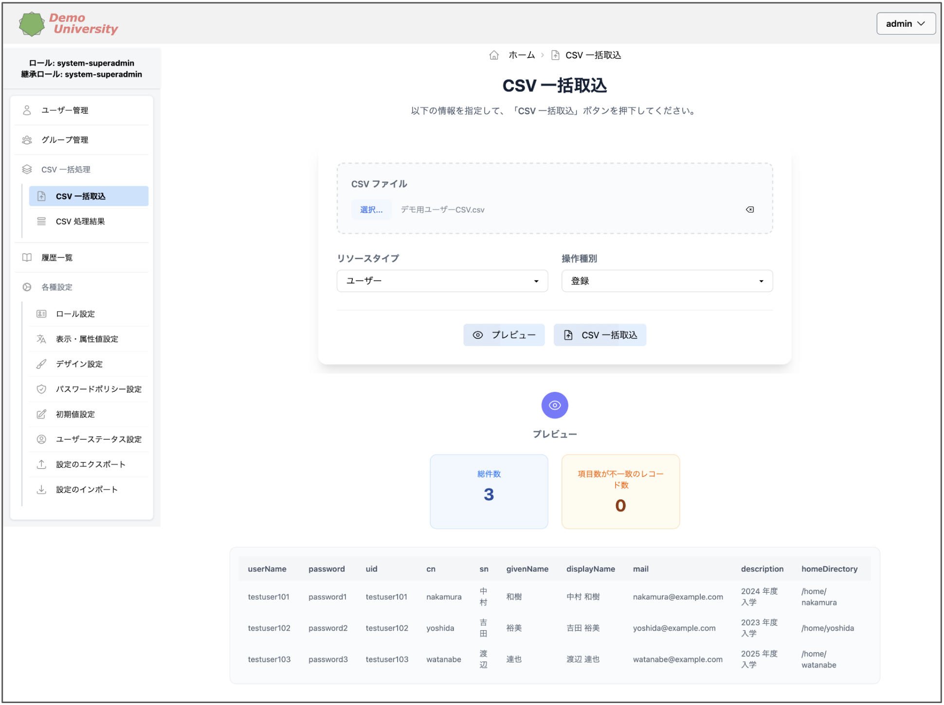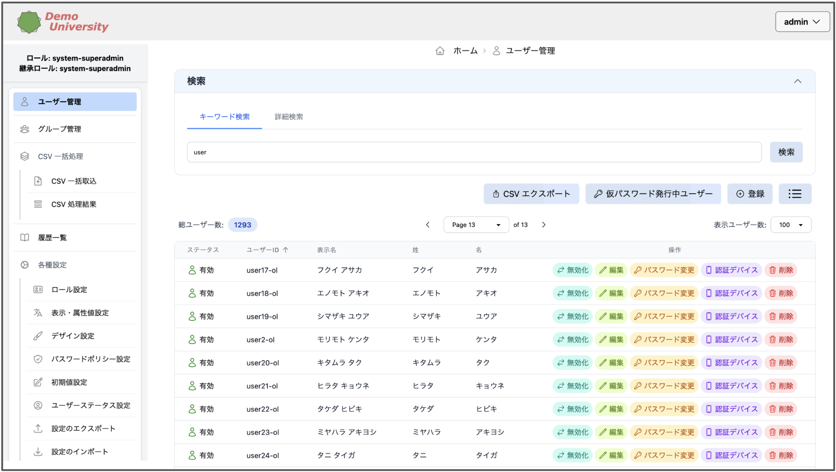 CSV 取込によるユーザー・グループ情報の一括処理が可能です。登録・更新・パスワード更新・削除に対応しています。