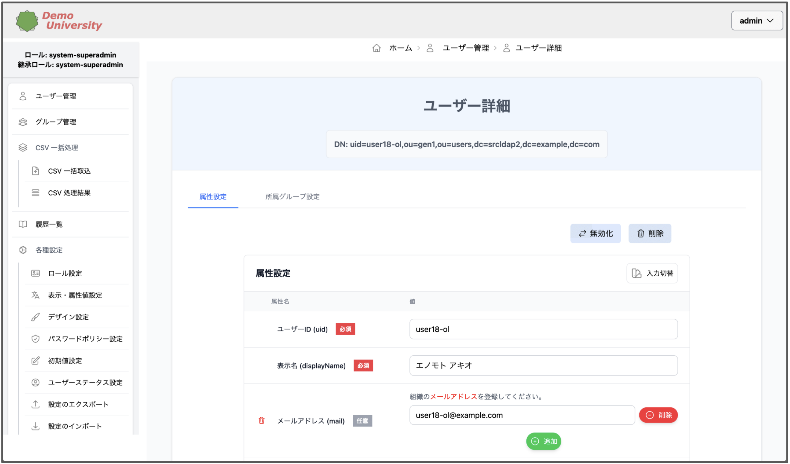 連携元 OpenLDAP, Active Directory に登録されているユーザー/グループの詳細情報を閲覧・編集できます。