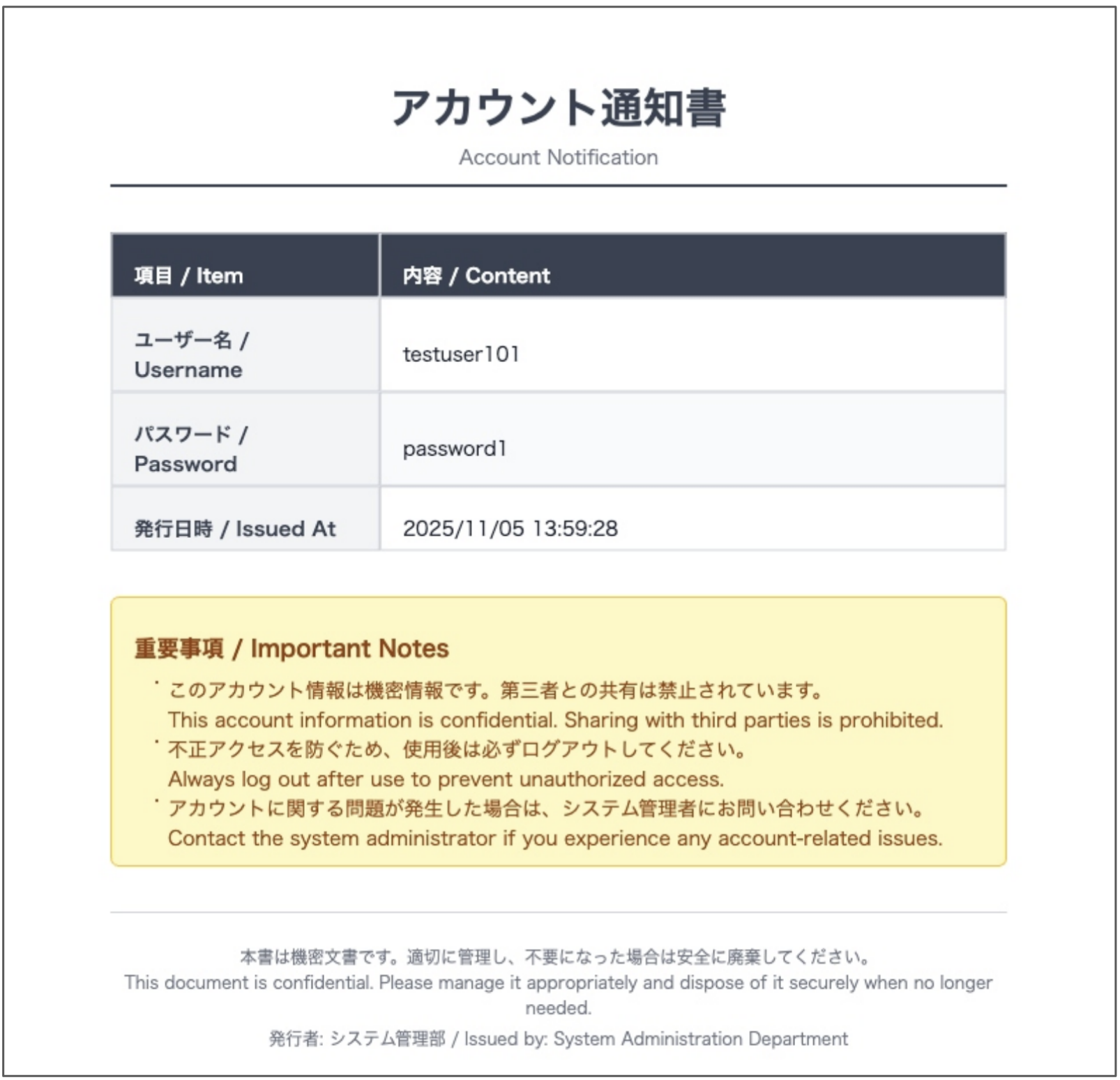 パスワードを含むユーザー登録/パスワード更新後に、アカウント通知書を発行できます。